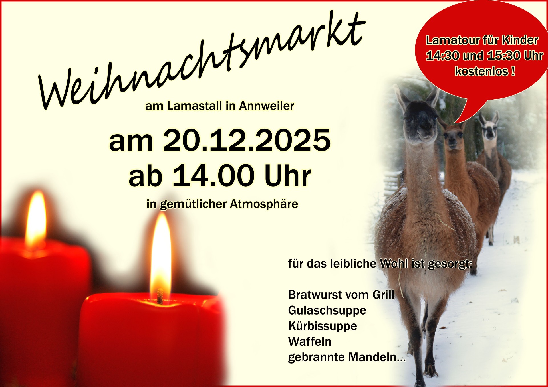 Wir behalten uns vor aus Sicherheit für Mensch und Tier, wenn notwendig die gebuchte Anzahl Lamas zu reduzieren.